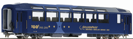 NEW LIVERY Between 2001~2006, a Ge4/48001~8004 and the updated Bs222 were re-liveried for the "100 Years of MOB" celebrations. Bs222 was a unique design, with square windows. At the time of this livery Bs222 was without the apron - this was added as part of the modifications for the GPP design. |