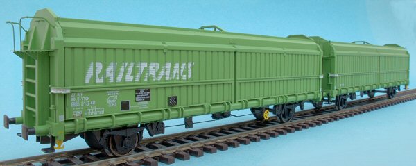 This wagon has a load capacity of 182 cubic metres. The wagon is loaded from above (opening 12.37 metres x 2 metres) and may be covered by a net or a lid. Unloading is effected by large side flaps patented by Railtrans which may be opened from above or below. The load is normally pushed out and falls into a bunker. By virtue of this ingenious construction handling times at the respective sites are kept to a minimum.