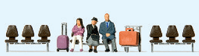 Three waiting travellers + Luggage trolley + Three rows of seats