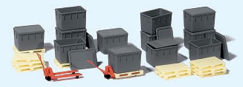 12 plastic stackable containers + loose lids + 12 pallets + 2 pallet trucks